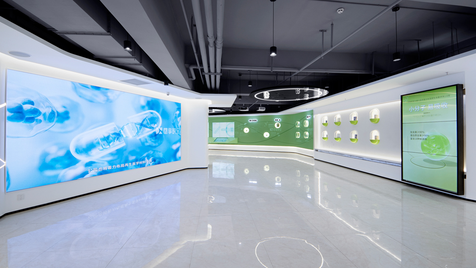 場(chǎng)景交融—從展廳直抵產(chǎn)業(yè)一線 研發(fā)透視窗,重現(xiàn)科研攻堅(jiān)時(shí)刻與成果; 鳥瞰沙盤聯(lián)動(dòng),俯覽智造基地全景; 流水線劇場(chǎng),追蹤骨粒凈化、酶解、凍干全生產(chǎn)流程,震撼詮釋“一粒膠原的誕生”。營造沉浸式現(xiàn)場(chǎng),讓參觀者穿透展廳,直擊產(chǎn)業(yè)一線。 |