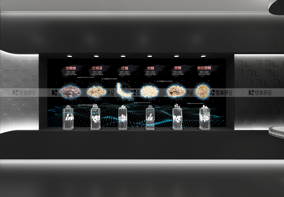水晶展臺(tái)上的中草藥實(shí)物,結(jié)合后方拼接屏內(nèi)容互動(dòng),綜合展現(xiàn)藥材療效,為后續(xù)中成藥介紹預(yù)留伏筆。 |