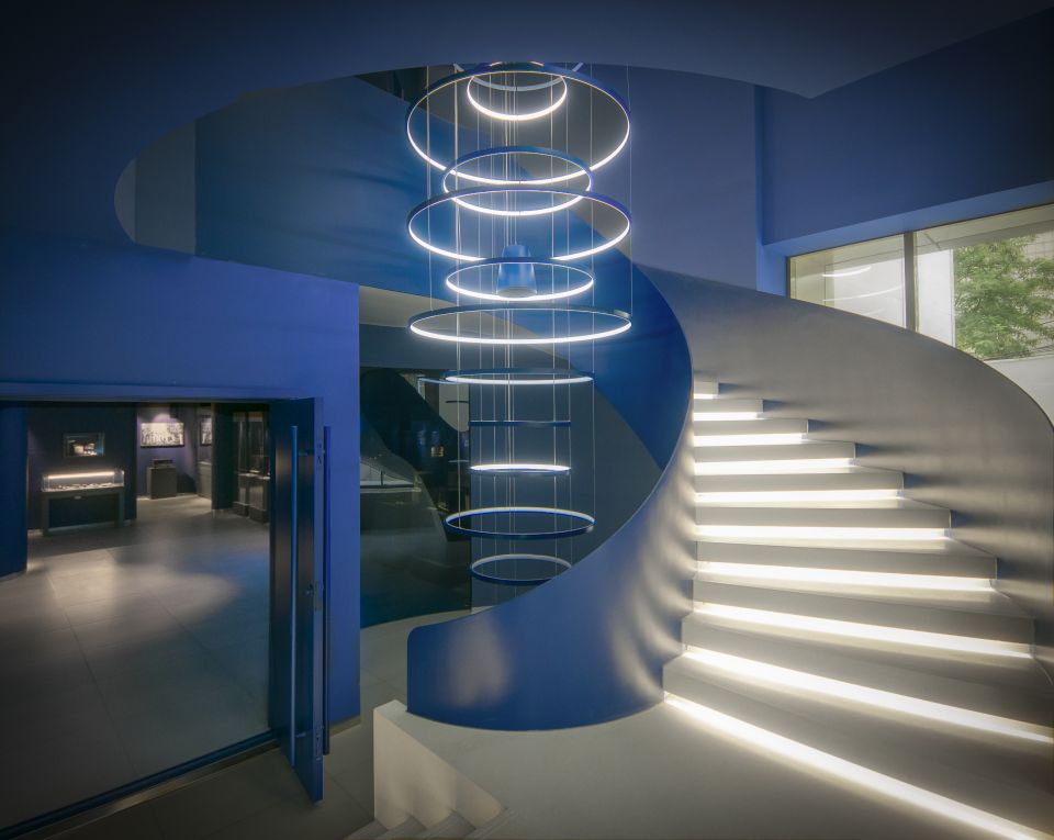 博物館雙層空間由“蔚藍(lán)色的電波”連接,在這里,拾級(jí)而上時(shí)能感受到源自海螺與音波元素的燈光變幻, 耳畔亦能響起從深海到海岸的蔚藍(lán)交響。 | |