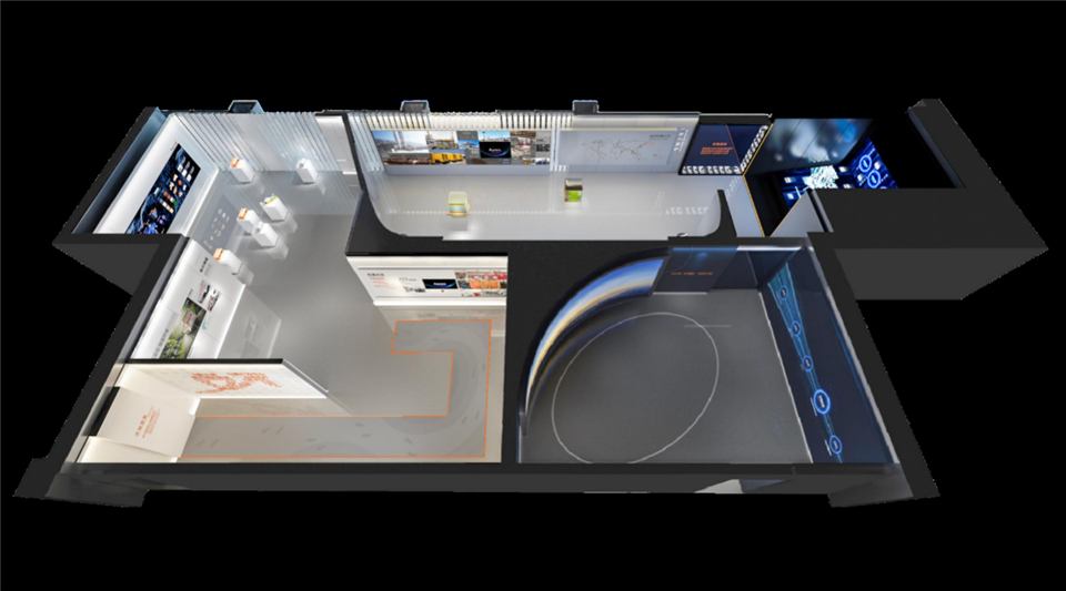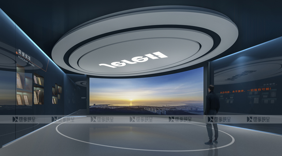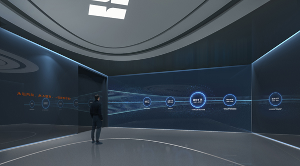 首先映入?yún)⒂^者眼簾的是寬幅弧形投影,用以介紹集團(tuán)概況;鏡面凹龕內(nèi)陳列企業(yè)榮譽(yù),燈光在影片結(jié)束后開(kāi)啟,展示功能自由切換。 |