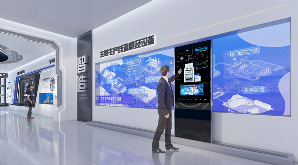 該空間設(shè)計(jì)秉持同一展區(qū)的整體性,規(guī)避現(xiàn)場(chǎng)不利條件進(jìn)行空間層次劃分。 拼接屏講述最頂尖的產(chǎn)品,內(nèi)容按需可切換。 |